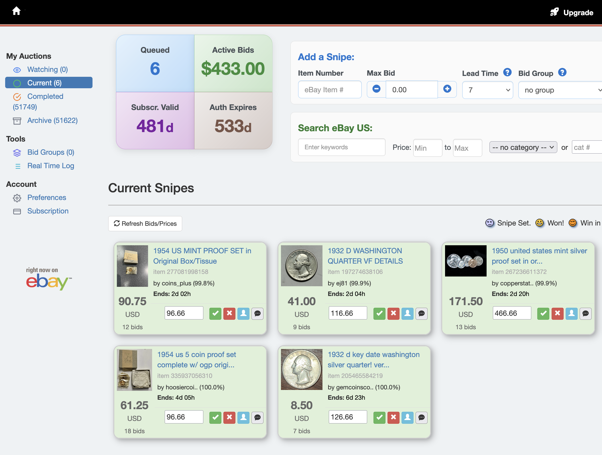 Importa tu Lista de Seguimiento y gestiona las pujas. Las vistas y configuraciones personalizables hacen que el sniping sea muy fácil.