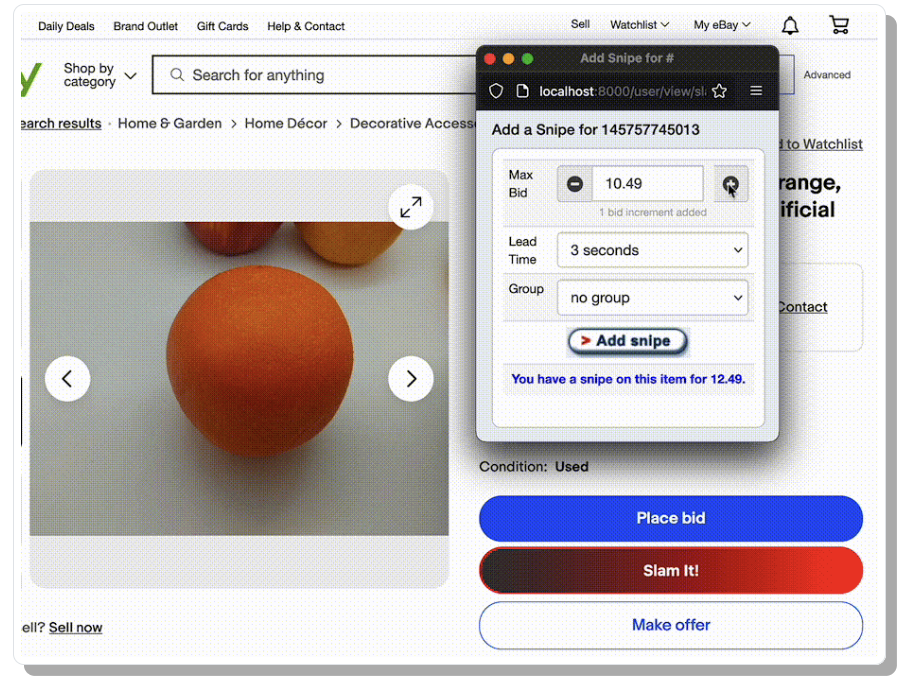 Instala nuestra extensión de navegador para snipear directamente desde una página de artículo de eBay.